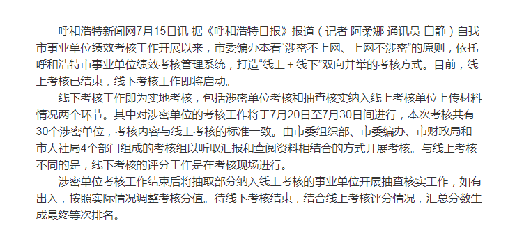 呼和浩特新聞網(wǎng)7月15日訊 據(jù)《呼和浩特日?qǐng)?bào)》報(bào)道(記者 阿柔娜 通訊員 白靜)自我市事業(yè)單位績(jī)效考核工作開展以來(lái),市委編辦本著“涉密不上網(wǎng)、上網(wǎng)不涉密”的原則,依托呼和浩特市事業(yè)單位績(jī)效考核管理系統(tǒng),打造“線上+線下”雙向并舉的考核方式。目前,線上考核已結(jié)束, ...